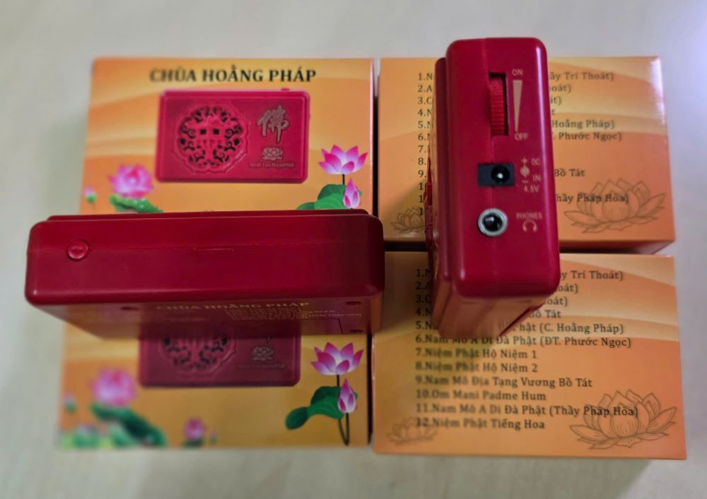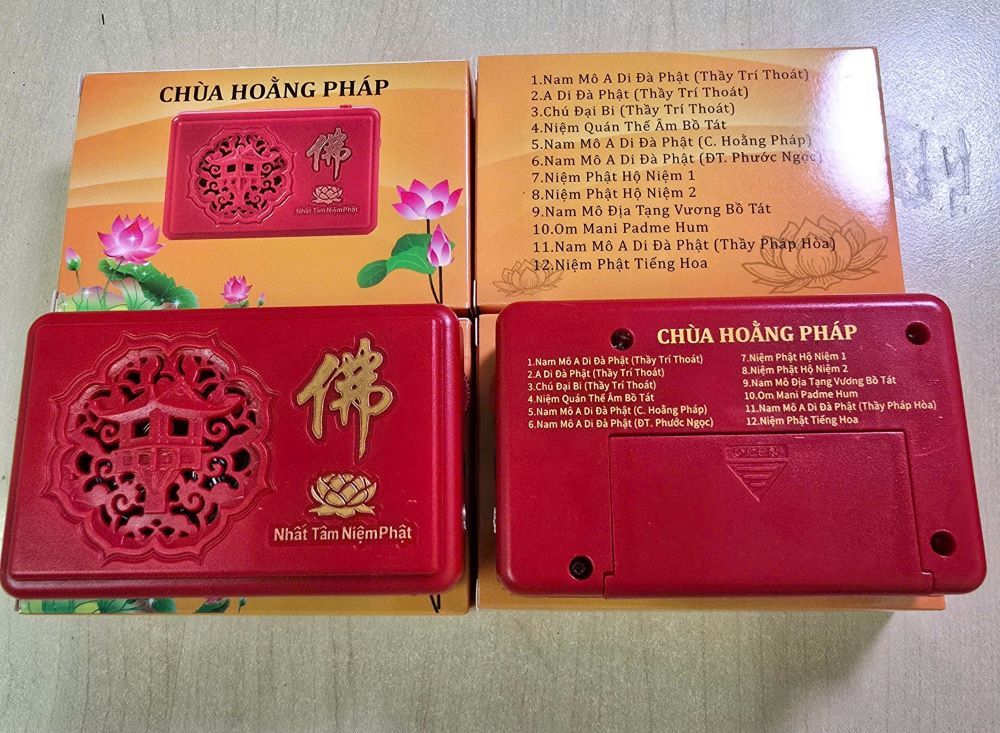 Máy niệm phật 12 bài hộp vàng được nâng cấp, cải tiếng từ máy 5 bài, đảm bảo chất lượng âm thanh nghe rõ và tốt hơn, giá máy đã bao gồm cục sạc Adaptor.