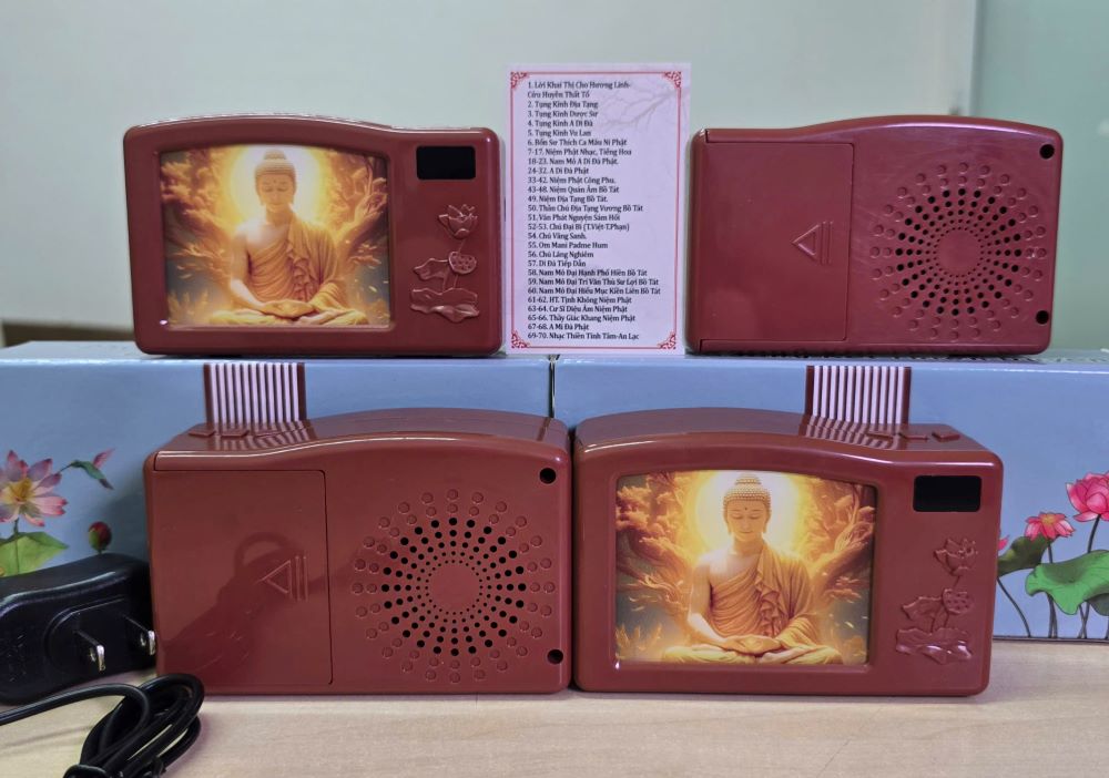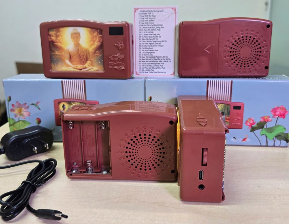 Máy niệm phật để bàn có 4 bộ kinh và có màn hình Led hình Phật có 70 bài chuyên dùng tụng kinh niệm phật cả ngày, đặt trên bàn thờ nghe ngày đêm. Máy dùng cắm trực tiếp vào nguồn điện Adaptor hoặc dùng 3 cục pin đồng hồ AA để phát kinh phật, giá máy đã bao gồm cục sạc Adaptor.